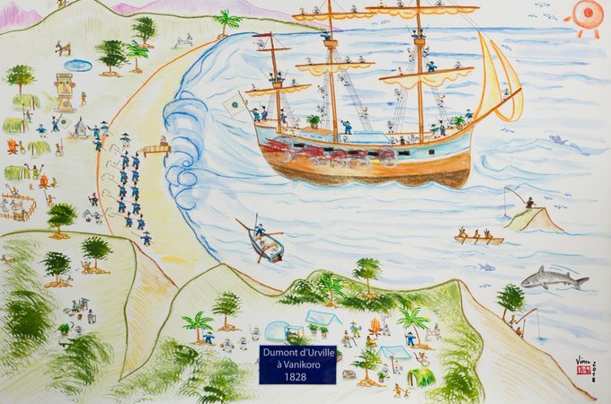 Un échelon précurseur de l'expédition de Dumont d'Urville découvre le 26 février 1828 à Vanikoro les vestiges de l'expédition de LA PÉROUSE. La mission de récupération ne peut être entreprise immédiatement du fait d'une épidémie de fièvre, elle débutera le 14 mars. Source : https://x.com/BertrandMagueur