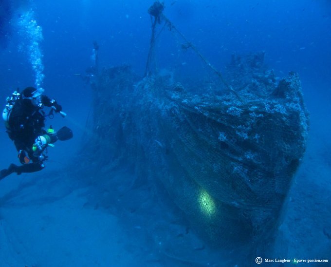 Les 14 rescapés du LAGOUBRAN coulé le 6 mars 1919 sont récupérés par le dragueur PIOCHE. L'épave du remorqueur à roues repose toujours aujourd'hui par 67m de fond dans la rade Sud de Marseille; Source : @BertrandMagueur