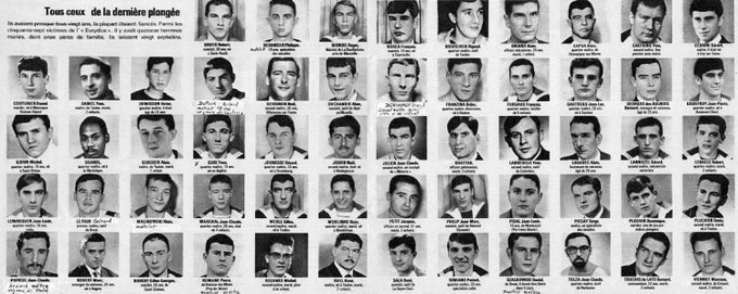 Le 4 mars 1970, à 07H28 du matin, les 57 marins formant l'équipage de l'EURYDICE trouvent la mort dans l'implosion de leur sous-marin. Le 4 mai suivant, on retrouvera l'épave par 750 m de fond au large du Cap Camarat. In memoriam. Source : @BertrandMagueur Localisation approximative