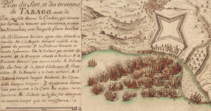 L'escadre du vice-amiral Jean d'Estrées attaque le 3 mars 1677 celle du commodore batave Jacob BINCKES en baie de Nieuw-Flushing (Tobago). Après un violent combat naval, l'ennemi est décimé au prix de 4 navires, mais les Français sont au final repoussés par les forces à terre. Les 4 navires perdus à Nieuw-Flushing (Tobago) le 3 mars 1677 sont le navire amiral GLORIEUX (incendié), l'INTRÉPIDE (échoué), le PRÉCIEUX (échoué) et le MARQUIS (incendié). Jean d'Estrées reviendra en décembre et s'emparera cette fois de l'île. 2 canons dont 1 en bronze des navires français perdus à Nieuw-Flushing sont remontés à la surface en juillet 1990 par le Groupe de Recherche en Archéologie Navale. Ces vestiges seraient toujours exposés devant les bâtiments du nouveau port de Scarborough. Source : @BertrandMagueur
